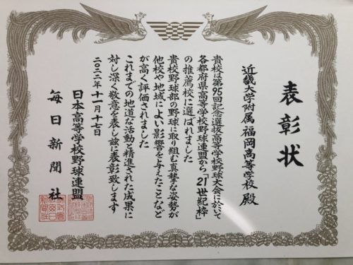 センバツ21世紀枠推薦校に近大福岡高 福岡県高野連が表彰状