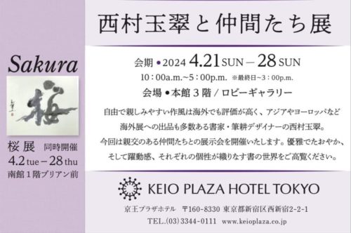 京王プラザホテルにて書作展開催 4月21日~28日未分類 2024.05.09 2024.04.18京王プラザホテルにて書作展開催 4月21日~28日 ※大盛況のうちに閉幕しました。今回のグループ展覧会にお声かけいただき私のコーナーまで作ってくださった西村先生、飾り付けからいろいろアドバイスいただきお世話になった京王プラザホテルの方々、グループの皆さん、小倉織、小倉祇園太鼓の方々、ご購入いただいた方々、ご観覧くださいました全ての皆様にこの場を借りて厚く感謝御礼申し上げます。